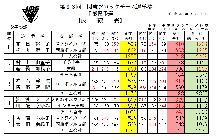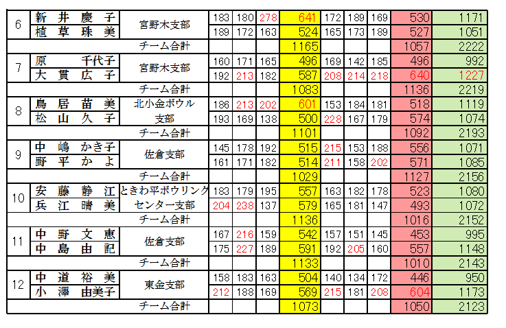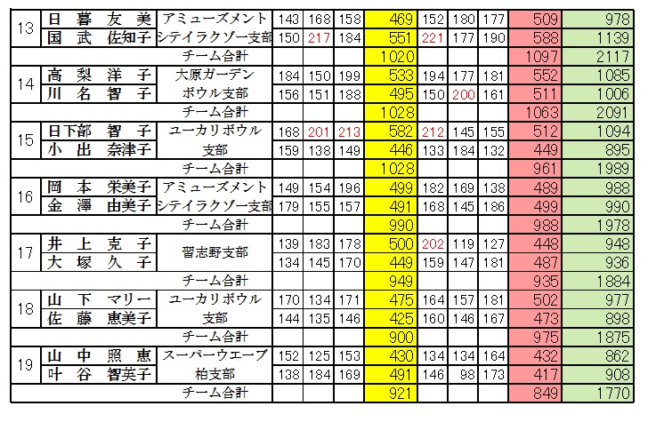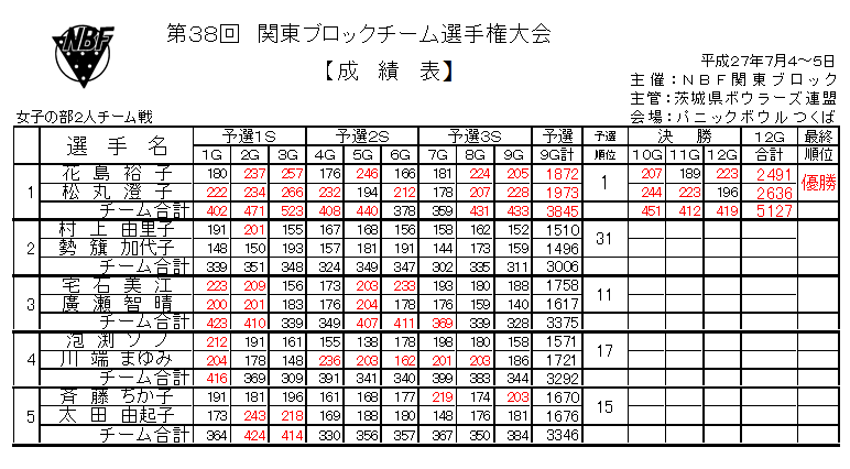 | 女子の部(2人チーム) 成績表 |