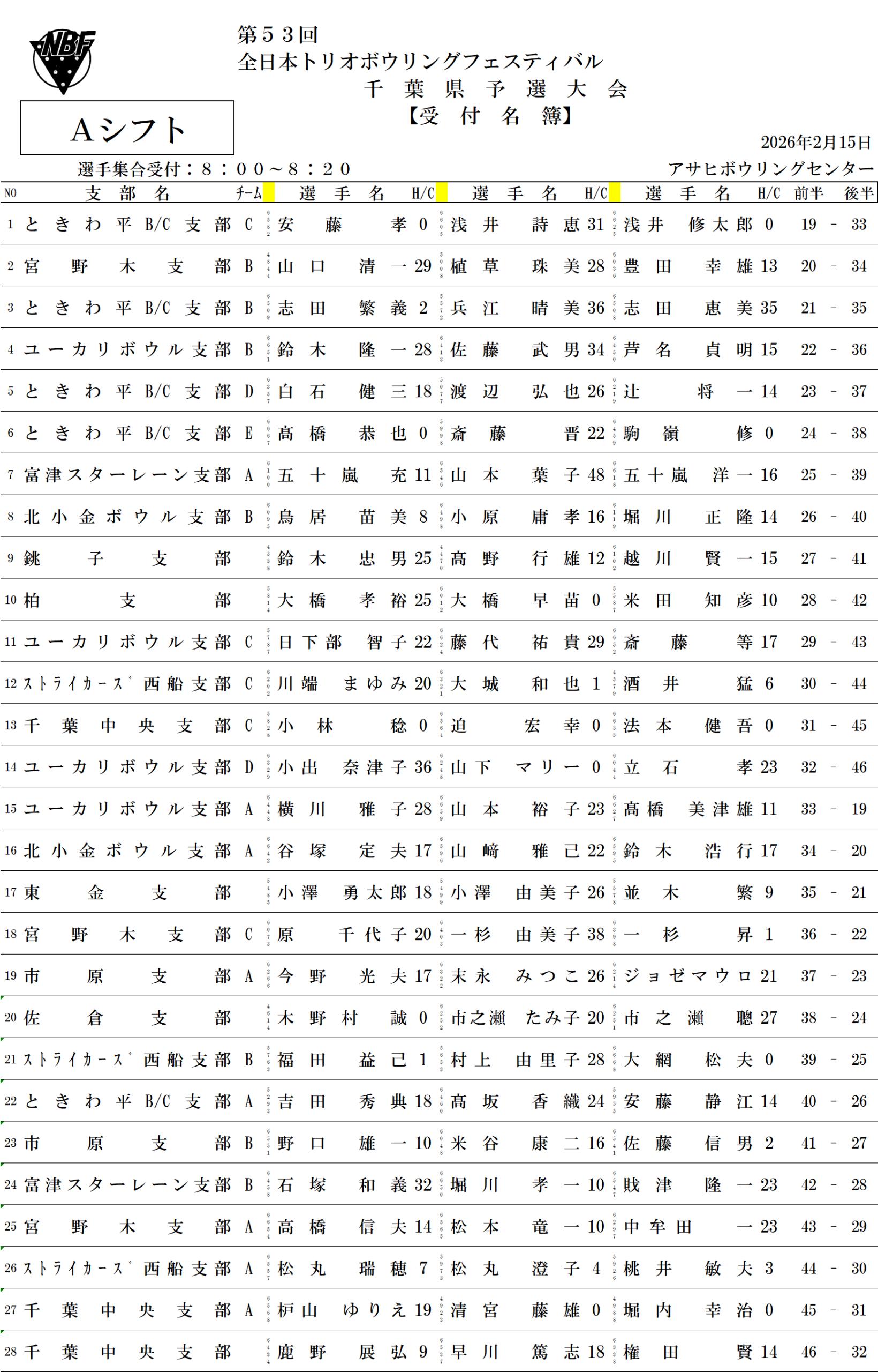 第53回全日本トリオボウリングフェスティバル―要項 2026年 2026.01.13 目次 大会要項レーン割本戦要項本戦レーン割 大会要項 オンライン申込はこちら レーン割 ※画像内では受付8:00~となっていますが、要項の通り9:00~受付です! 本戦要項 本戦レーン割